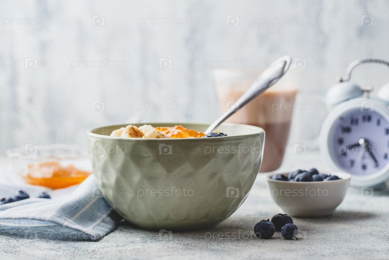 Завтрак с молочной рисовой кашей с бананами, черничным и апельсиновым джемом, сливочным рисовым пудингом или французским рисом с молоком в миске, стеклянной чашкой с какао и будильником