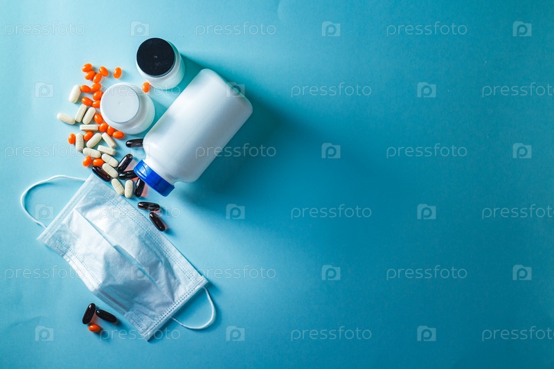 Бутылка и таблетки на синем фоне, вид сверху. Концепция аптеки здравоохранения. Корона вирус