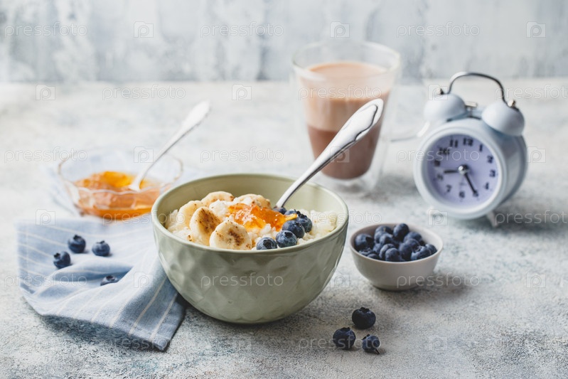 Завтрак с молочной рисовой кашей с бананами, черничным и апельсиновым джемом, сливочным рисовым пудингом или французским рисом с молоком в миске, стеклянной чашкой с какао и будильником