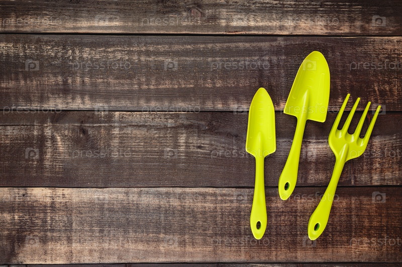 Садовые инструменты - совки и грабли на деревянном фоне. Концепция садоводства, весна, время посева