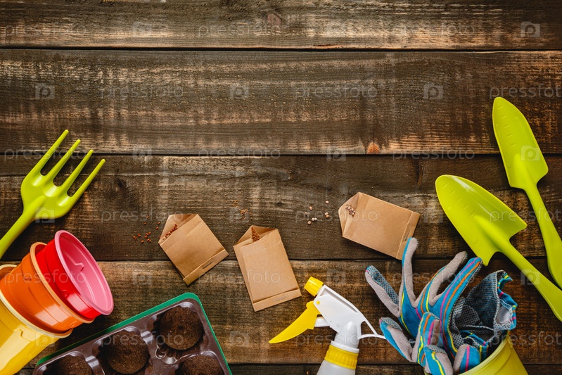 Садовые инструменты - совки и грабли, семена в бумажных пакетах, торфяные таблетки в контейнере для рассады, перчатки и распылитель на деревянном фоне. Концепция садоводства, весна, время посева