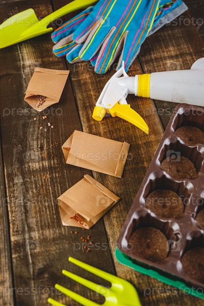 Садовые инструменты - совки и грабли, семена в бумажных пакетах, торфяные таблетки в контейнере для рассады, перчатки и распылитель на деревянном фоне. Концепция садоводства, весна, время посева