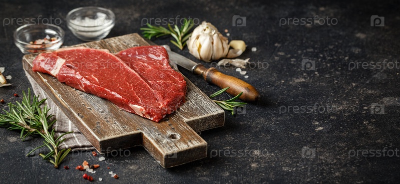 Сырой свежий стейк подается с розмарином, чесноком и специями на деревянной разделочной доске. Мясо говядины Блэк Ангус. Длинный широкий баннер