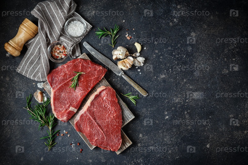 Два сырых свежих стейка подаются с розмарином, чесноком и специями на деревянной разделочной доске. Мясо говядины Блэк Ангус. Вид сверху, место для текста