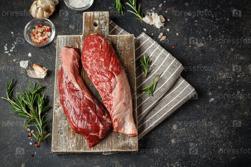 Сырой свежий стейк с вырезкой, подается с розмарином, чесноком и специями на деревянной разделочной доске. Мясо говядины Блэк Ангус. Вид сверху