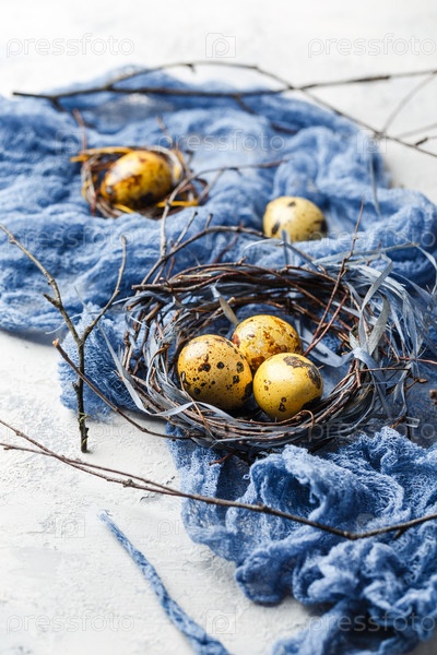 Цветные желтые пасхальные перепелиные яйца в небольших гнездах. Малая глубина резкости