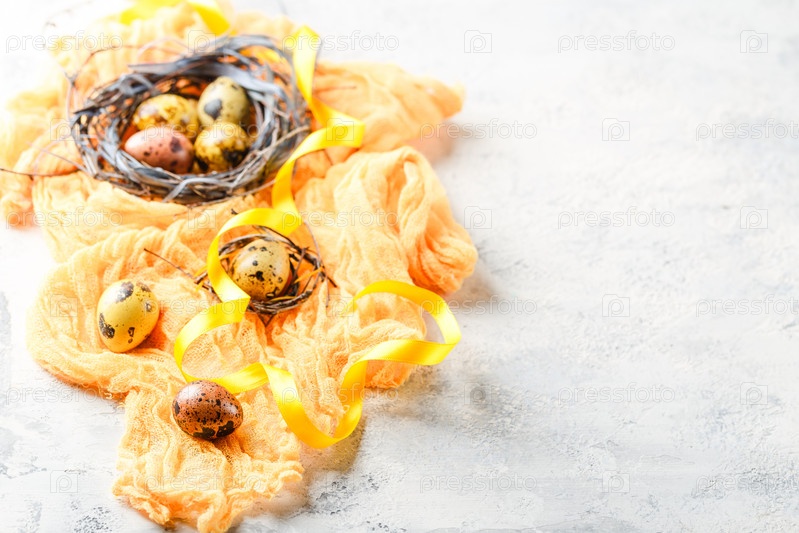Цветные желтые и коричневые пасхальные перепелиные яйца в небольших гнездах. Малая глубина резкости. Место для текста