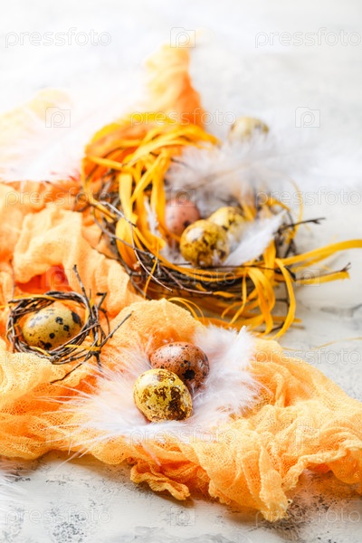 Цветные желтые и коричневые пасхальные перепелиные яйца с перьями в небольших гнездах. Малая глубина резкости