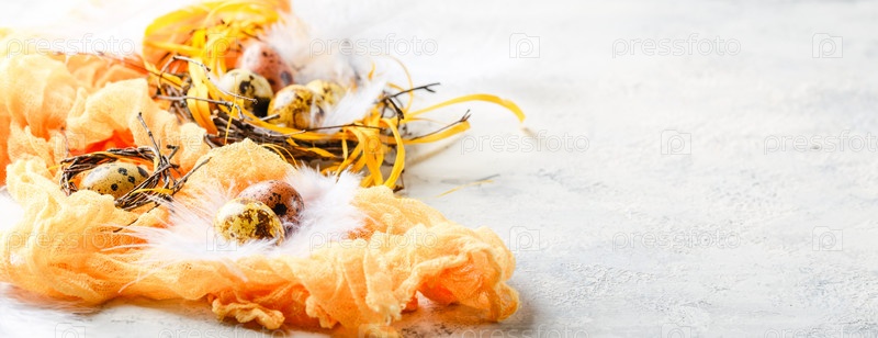 Цветные желтые и коричневые пасхальные перепелиные яйца с перьями в небольших гнездах. Малая глубина резкости. Место для текста. Длинный широкий баннер