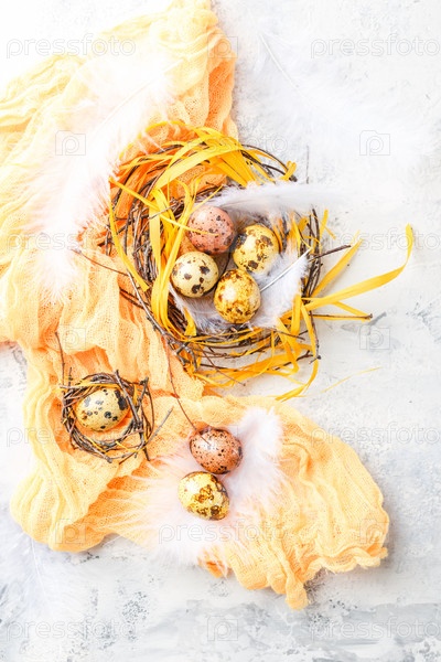 Цветные желтые и коричневые пасхальные перепелиные яйца с перьями в небольших гнездах. Малая глубина резкости. Вид сверху