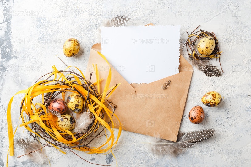Цветные желтые и коричневые пасхальные перепелиные яйца с перьями в небольших гнездах и поздравительной открыткой в конверте. Малая глубина резкости. Вид сверху. Место для текста