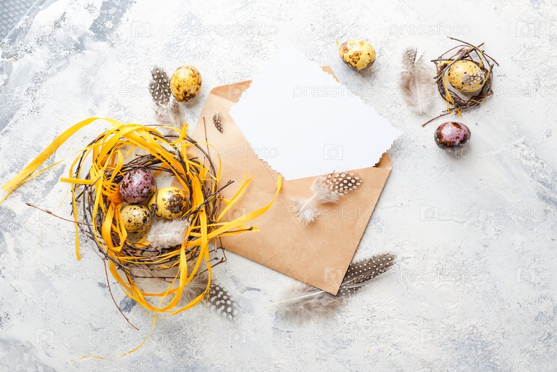 Цветные желтые и фиолетовые пасхальные перепелиные яйца с перьями в небольших гнездах и поздравительной открыткой в конверте. Малая глубина резкости. Вид сверху. Место для текста