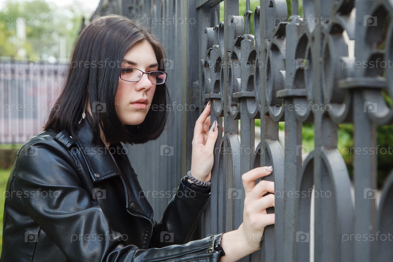 Грустная молодая девушка в черной куртке стоит возле металлического забора на городской улице в летний день. крупным планом открытый