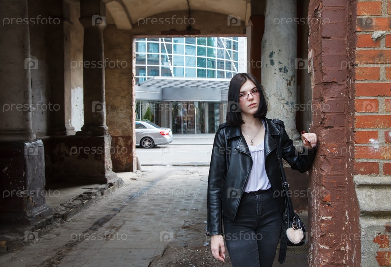 Грустная молодая девушка в черной куртке и джинсах стоит в старой арке на городской улице в летний день. крупным планом открытый