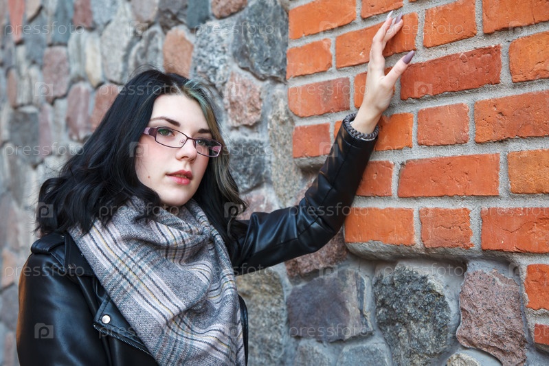 Портрет молодой брюнетки в черной куртке, стоящей у стены старого каменного замка в осенний день