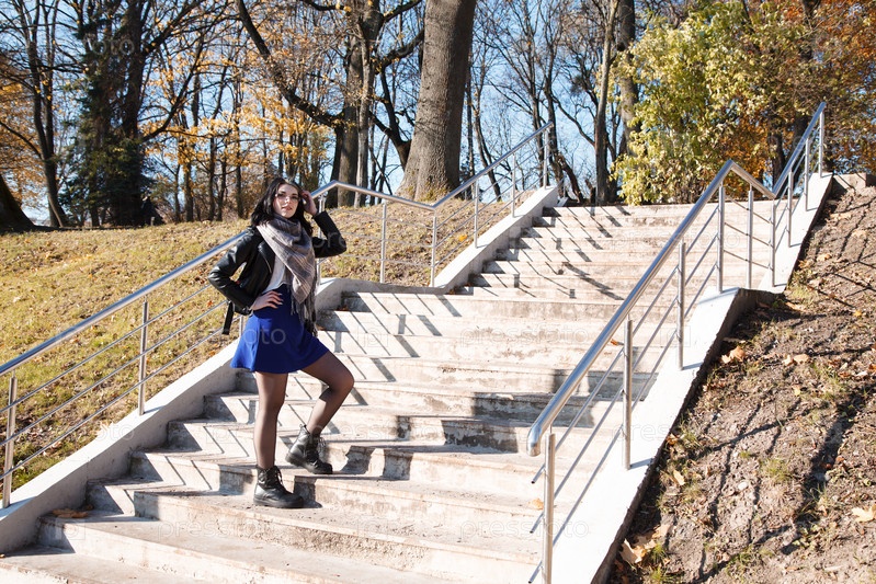 Молодая брюнетка в черной куртке и голубом платье стоит на лестнице в городском парке в солнечный осенний день