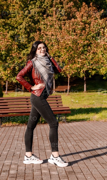 Молодая девушка в коричневой куртке и черных джинсах стоит на аллее в городском парке в солнечный осенний день