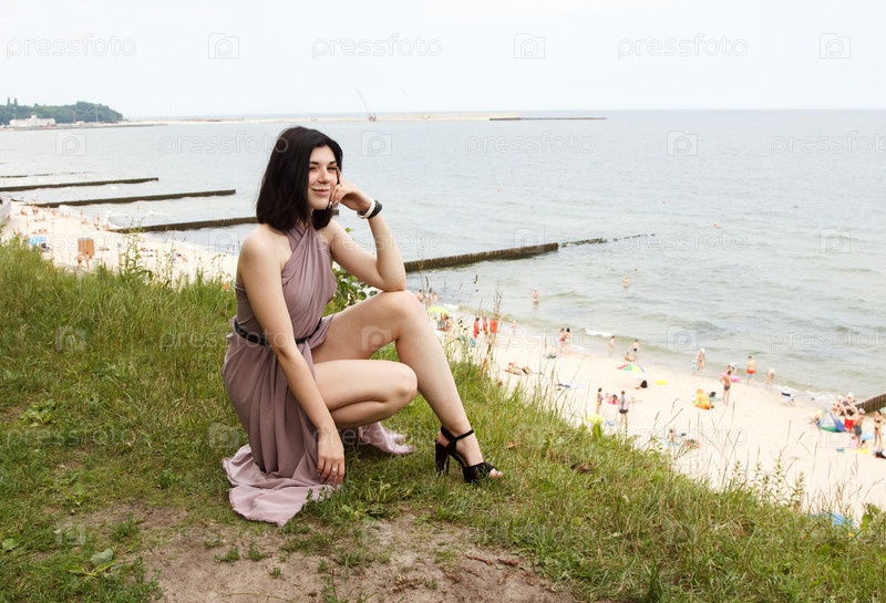 Молодая женщина сидит у моря