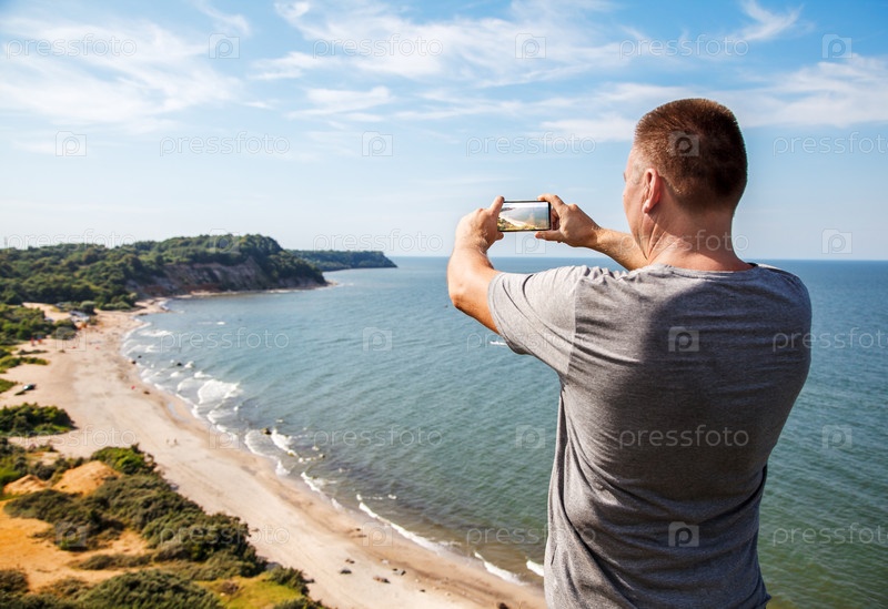 Мужчина в серой футболке фотографирует морской пейзаж