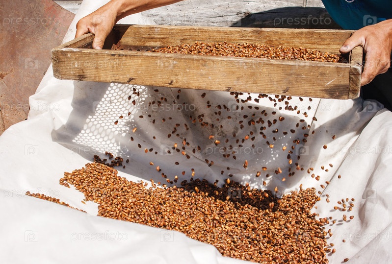 Мужчина просеивает кедровые орехи через сито