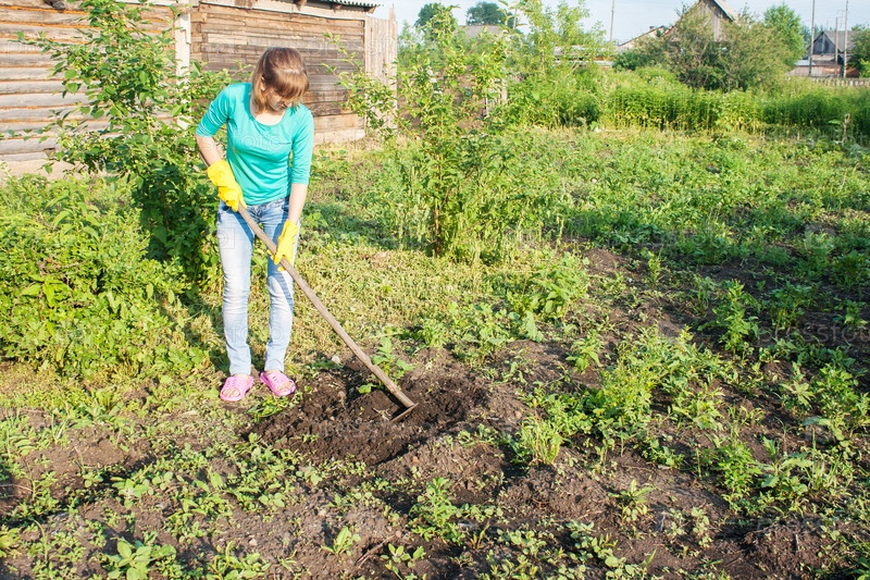 Молодая женщина пропалывает ростки картофеля мотыгами