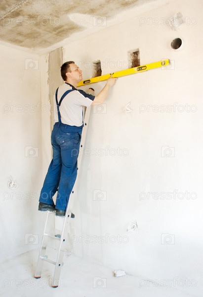 Рабочий проверяет стену уровнем