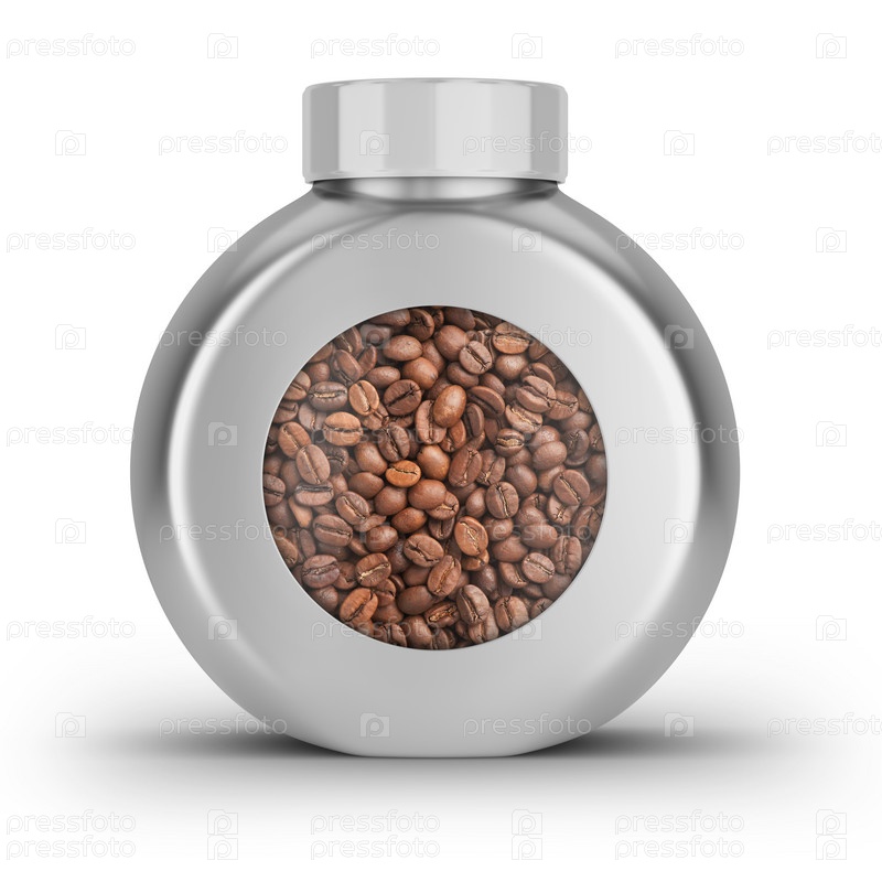 Пищевая банка с жареными кофейными зернами, изолированными на белом