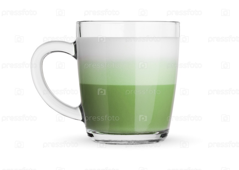 Зеленый чай маття с молоком в стеклянной чашке. Изолированный