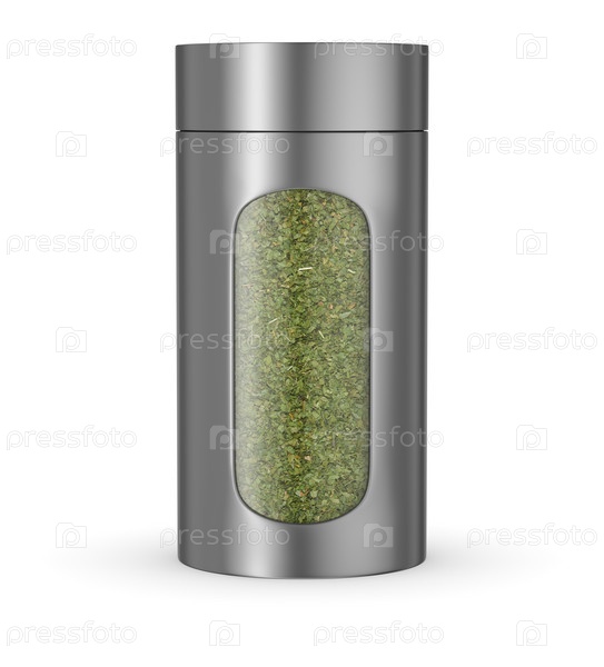 Пищевая банка с сухой петрушкой, изолированная на белом