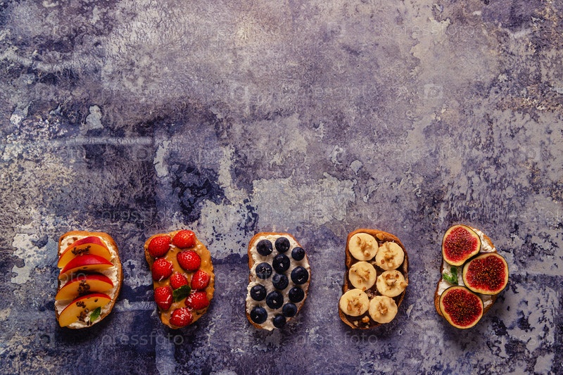 Домашний летний тост со сливочным сыром, ореховым маслом и фруктами и ягодами