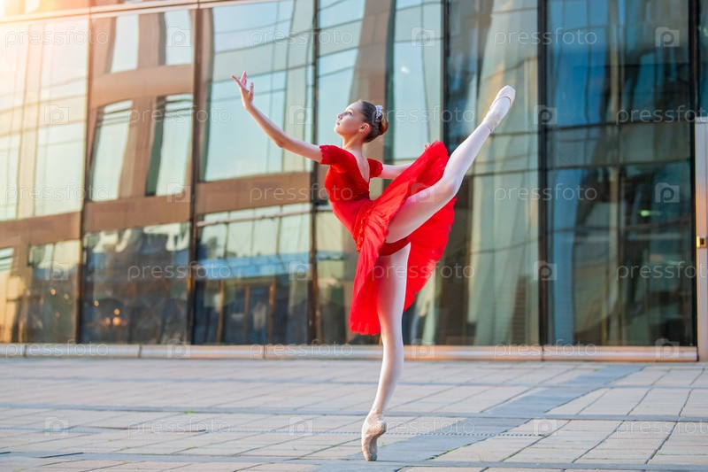 Юная балерина в красной пачке танцует на фоне городского пейзажа