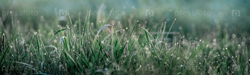 Свежая сочная молодая трава в каплях утренней росы, весна на макросе природы. Капли воды на траве, натуральные обои, панорамный вид, мягкий фокус
