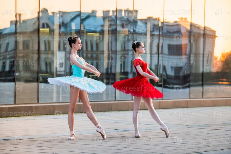Две молодые балерины в ярко-красной и синей пачке танцуют на фоне отражения городского заката