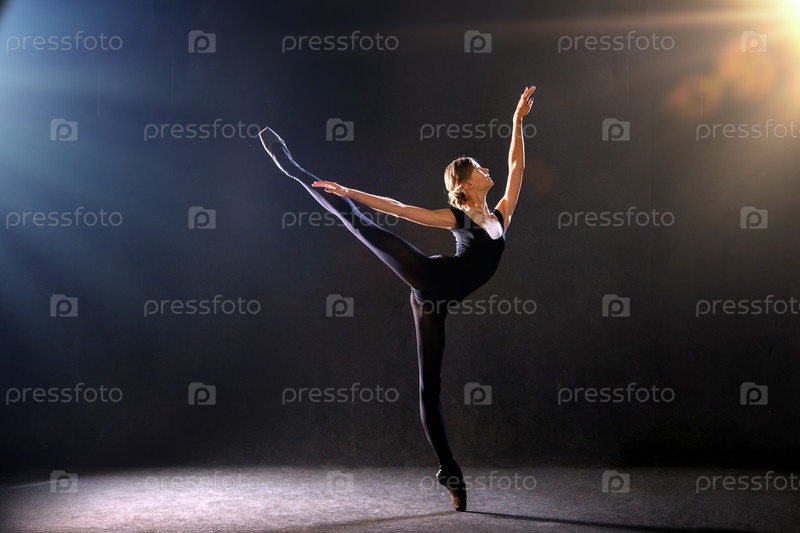 Балерина в облегающем костюме танцует на черном фоне на пуантах, силуэт освещен источниками цвета