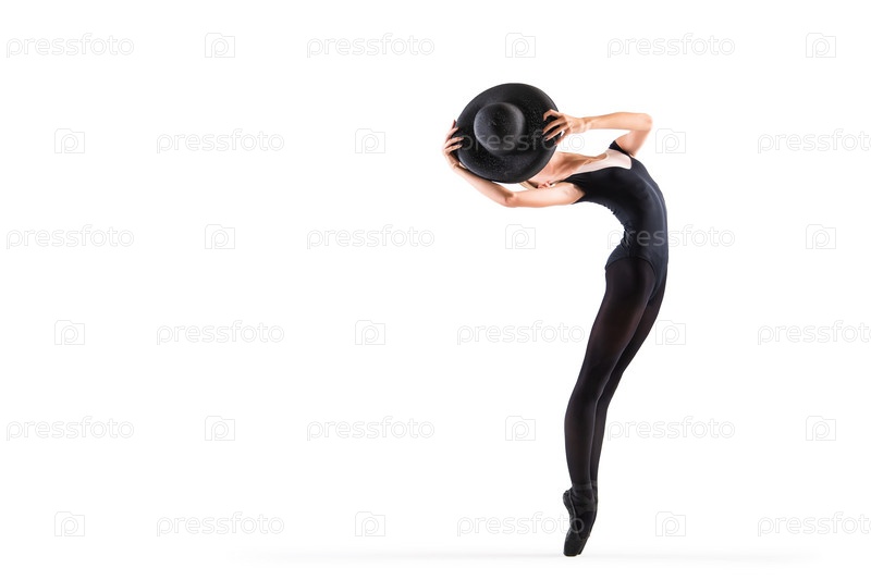 Юная балерина в черных пуантах и элегантной шляпе позирует на белом фоне