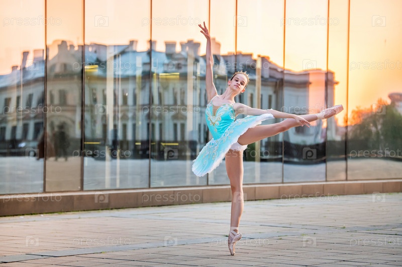 Юная балерина танцует на пуантах в нежной мятно-голубой пачке на фоне отражения заката в городе