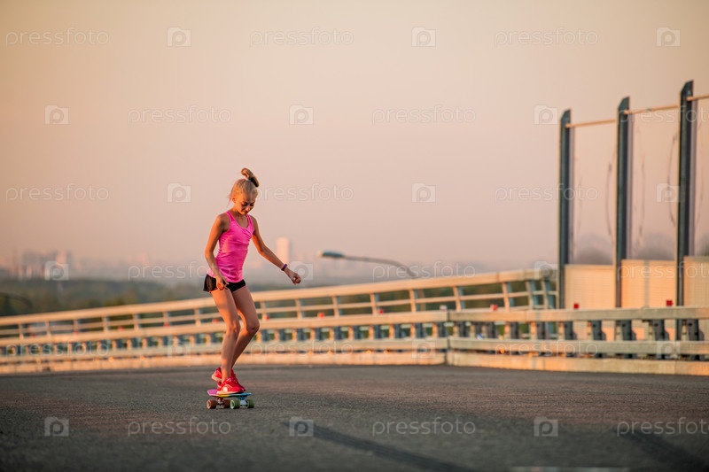 Девушка учится кататься на скейтборде на фоне панорамы вечернего города