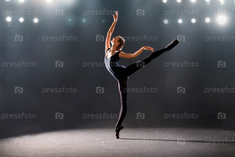 Балерина в облегающем костюме танцует на черном фоне на пуантах, силуэт освещен источниками цвета