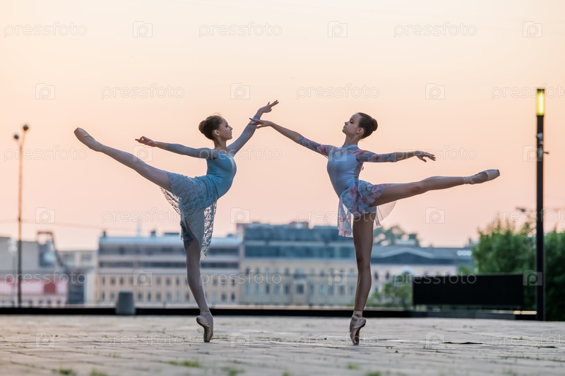 Две молодые балерины танцуют в пуантах в городе на фоне закатного неба