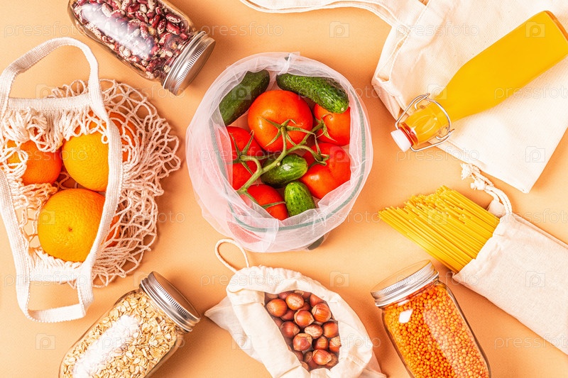 Изделия в тканевых мешках, стеклянная посуда. Экологичный шопинг