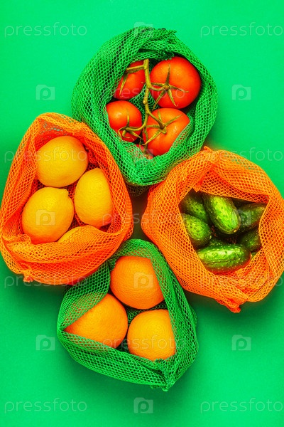 Свежие фрукты и овощи в многоразовых тканевых сетчатых мешках