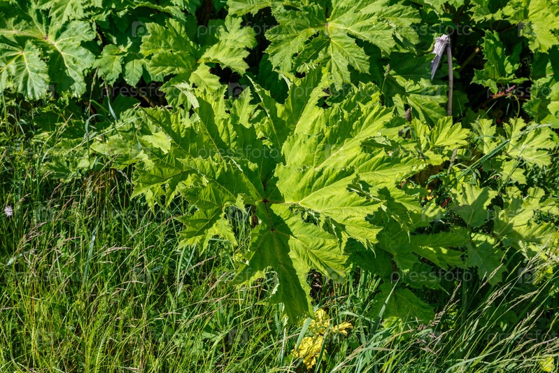 Борщевик Сосновского. Гераклеум Сосновский. Большие зеленые листья борщевика в солнечный день