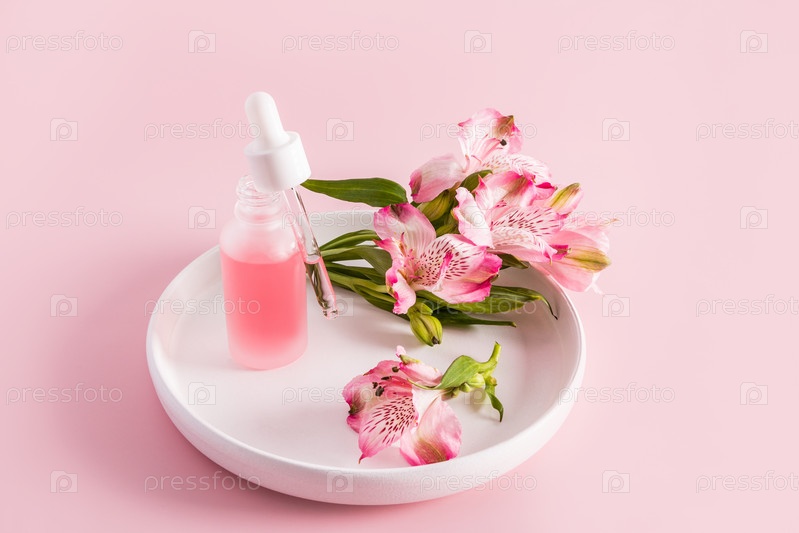Открытая матовая белая бутылка с наполненной пипеткой натурального увлажняющего крема для ухода за кожей лица стоит на белой керамической тарелке. розовый фон