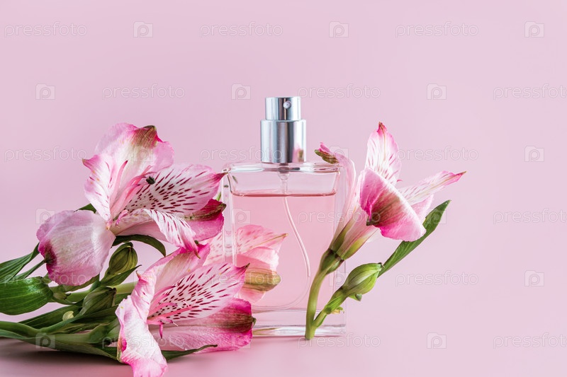 Прозрачный флакон духов и элегантная композиция с весенними цветами на розовом фоне. передний план. пространство для копирования. презентация аромата