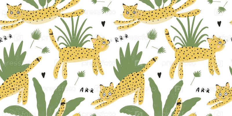 Бесшовный рисунок с леопардами и листьями на белом фоне. Детская иллюстрация. Забавные обои с животными. Ручной рисунок ткани, обоев, бумаги для детской комнаты
