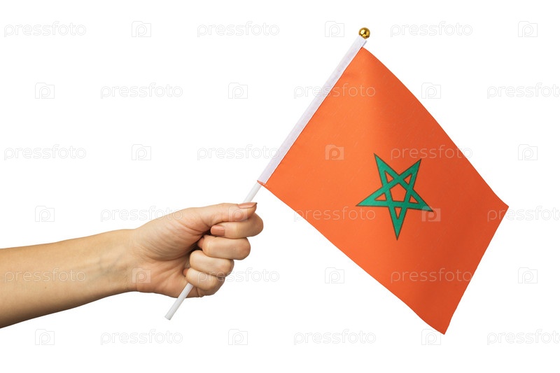 Женская рука держит флаг Марокко на белом фоне, шаблон для дизайнеров