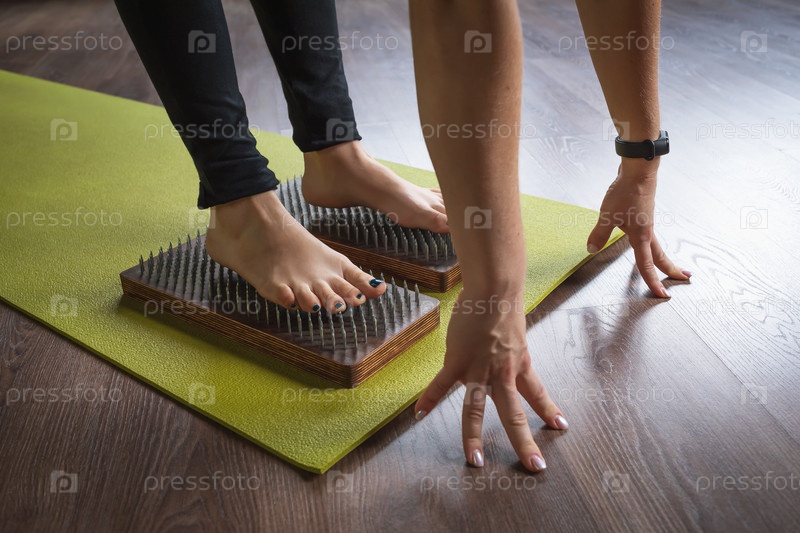 Женщина, практикующая йогу, стоящая на доске садху с гвоздями, занимающаяся укреплением здоровья