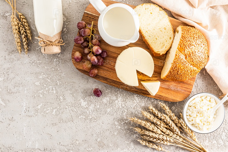 Свежие молочные продукты, буханка хлеба, букет колосьев, яблоки для празднования еврейского Шавуота. вид сверху. пространство для копирования