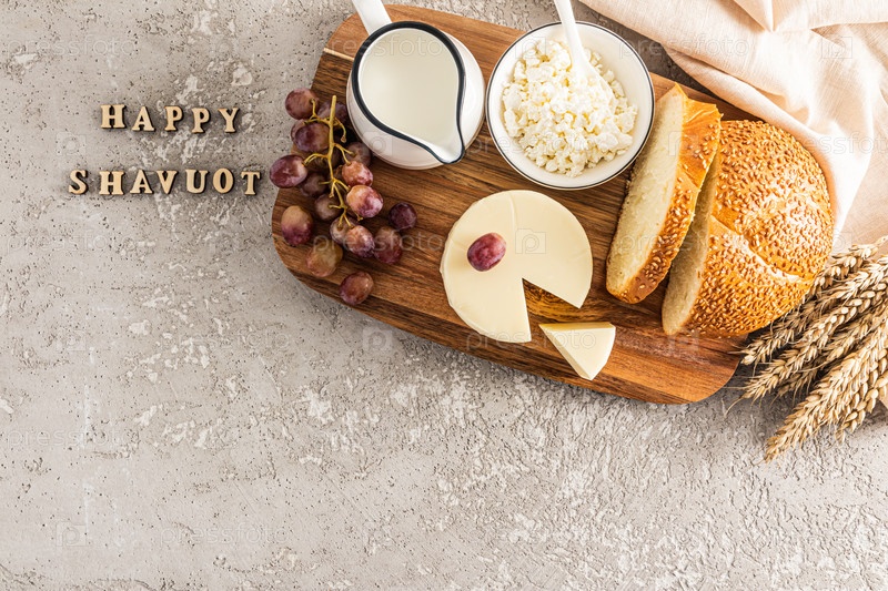 Весенний праздник евреев Шавуот. праздничная открытка с традиционной едой и кукурузными початками. деревянные буквы на сером фоне - счастливого шавуота