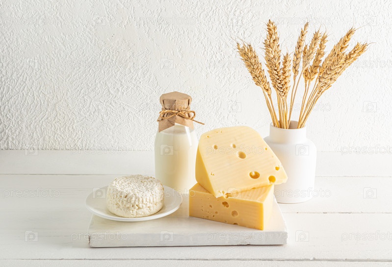 Красивая праздничная композиция к еврейскому празднику Шавуот. молочные продукты на белой деревянной доске и ваза с хлебными колосьями. белый фон